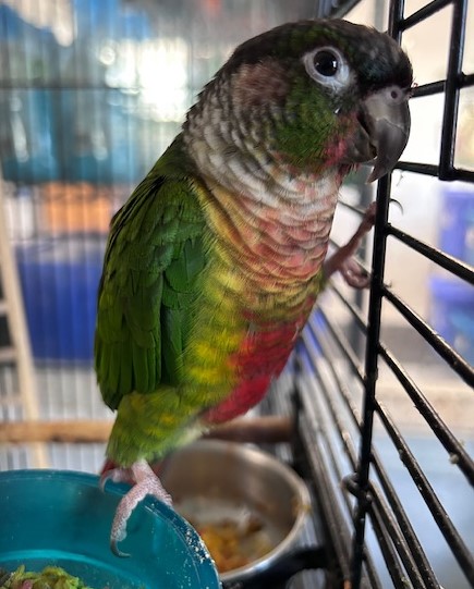 Hi - our names are Otis and Ringo and we are a very bonded pair of conures. Otis is a green cheek conure about three years old and probably female. Ringo is a black capped conure about four years old and probably male. We didn't fit into our owners flock forcing our surrender. We love to eat fresh fruits and veg as well as Zupreem fruitblend pellets and some seed. We are somewhat cage dominant, and won't step up, Ringo prefers women. We like to shred things. We must be adopted together and our adoption fee is $400 each or $800. We both like to bathe in our water bowl. Ringo is very protective and dominant over Otis. We need someone who will be patient with us and give us a forever home.