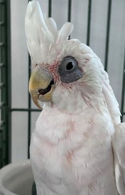 Hi - My name is Pogo and I am a 35 year old bare-eyed cockatoo (gender unknown). I eat pellets, veggies and fruits. I am tame and will step up and of course I am quite loud and opinionated. I do prefer men. I need a lot of toys and things to keep my entertained. I like to take spray baths, and my whole vocabulary is loudly saying watcha doing. I have been in one home my entire life and will require time to settle in at a new home/family. I like hanging toys. I have some health issues and I'm on a special diet now of low fat pellets, no seed allowed. My adoption fee is $500.